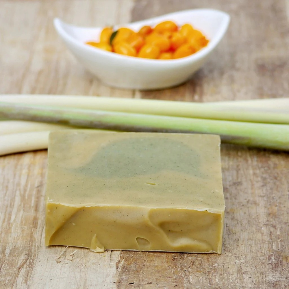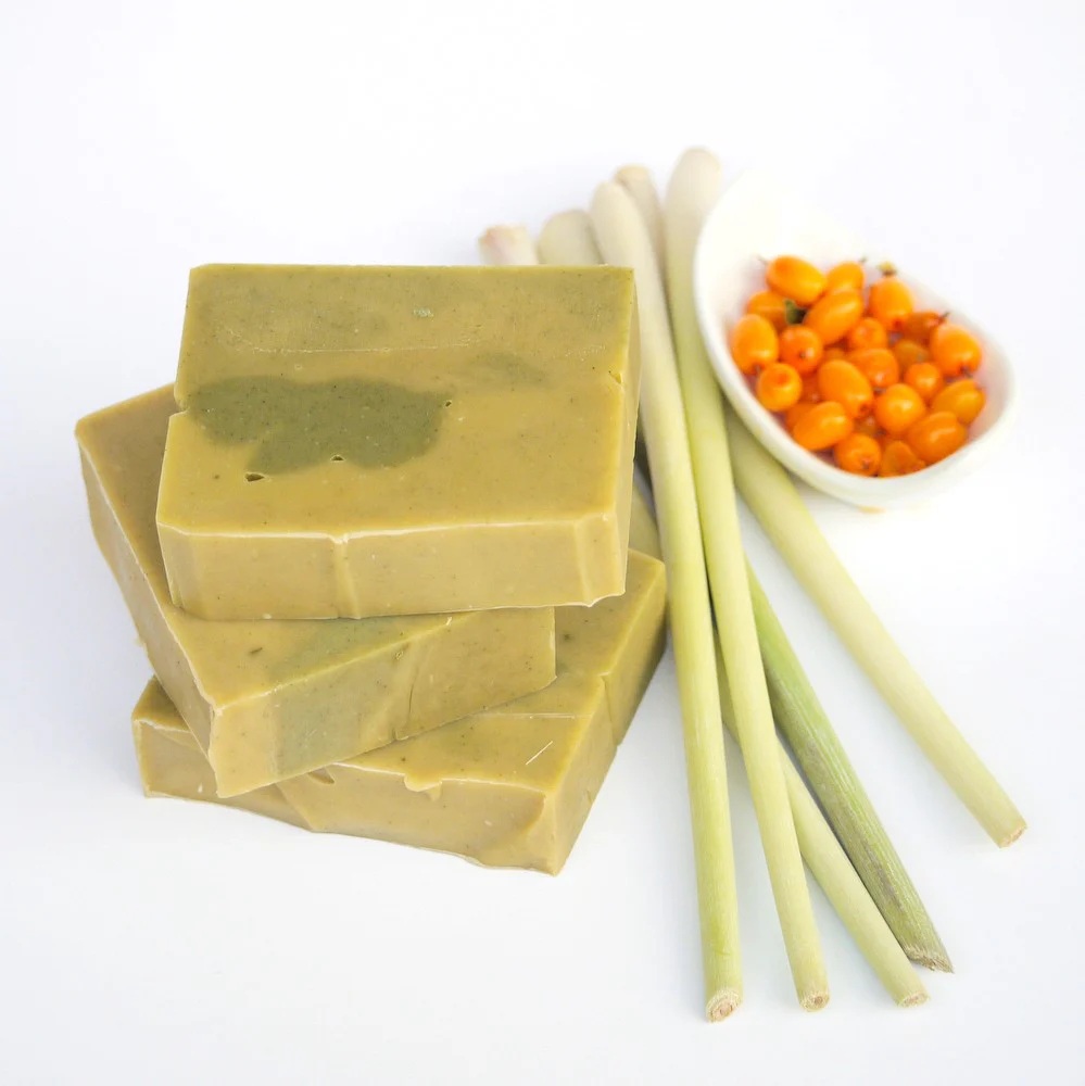 Cocos Nucifera Oil (kokosový olej), Olea Europaea Fruit Oil (olivový olej), Aqua (voda), Butyrospermum Parkii Fruit Butter (bambucké maslo), Helianthus Anuus Seed Oil (slnečnicový olej), Sodium Hydroxide (hydroxid sodný), Ricinus Communis Seed Oil (ricínový olej), Hippophae Rhamnoides Fruit Extract (organický rakytníkový olejový extrakt, pôvod EU), Cymbopogon flexuosus Oil (silica - lemongras), Melaleuca Alternifolia Oil (silica – čajovník), Spirulina Platensis Powder(spirulína-riasa), Chlorella Pyrenoidosa Powder(chlorela-riasa), Citral*, Geraniol*, Limonene*, Linalool*, Citronellol*, Eugenol*